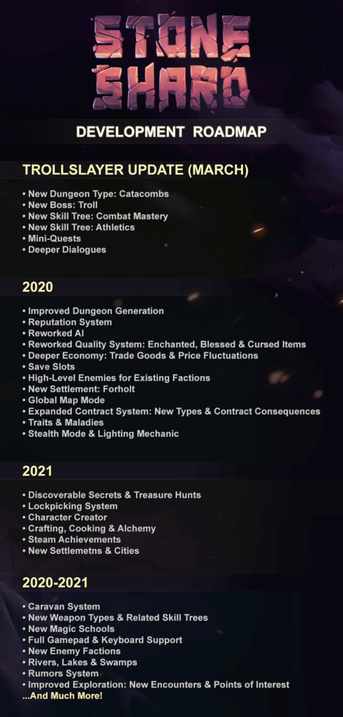 Stoneshard developer revealed their 2020-2021 plans via a roadmap earlier this month. It details the current state of the game on Steam Early Access and when certain features will arrive. However, it’s not all that specific right now.