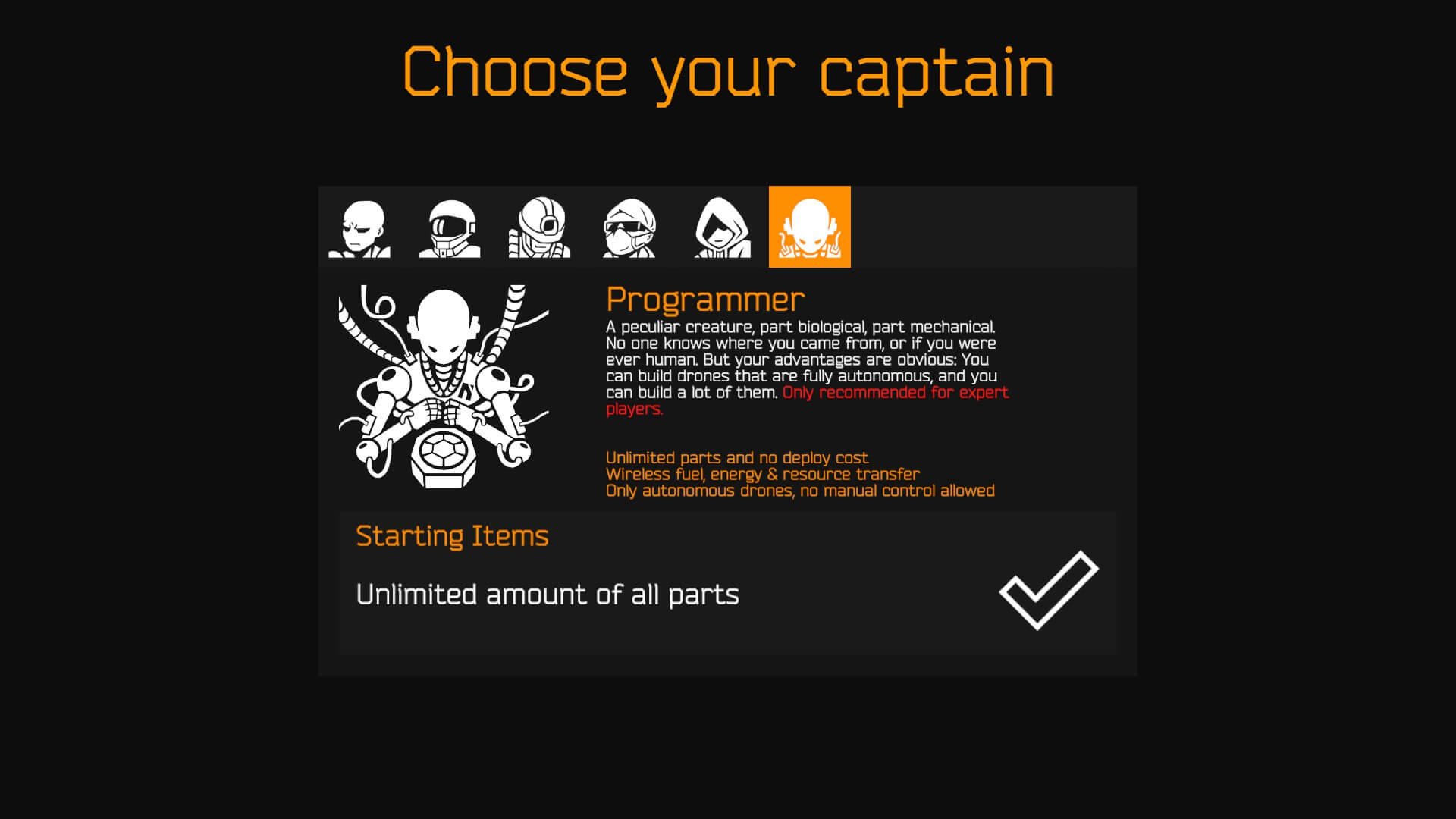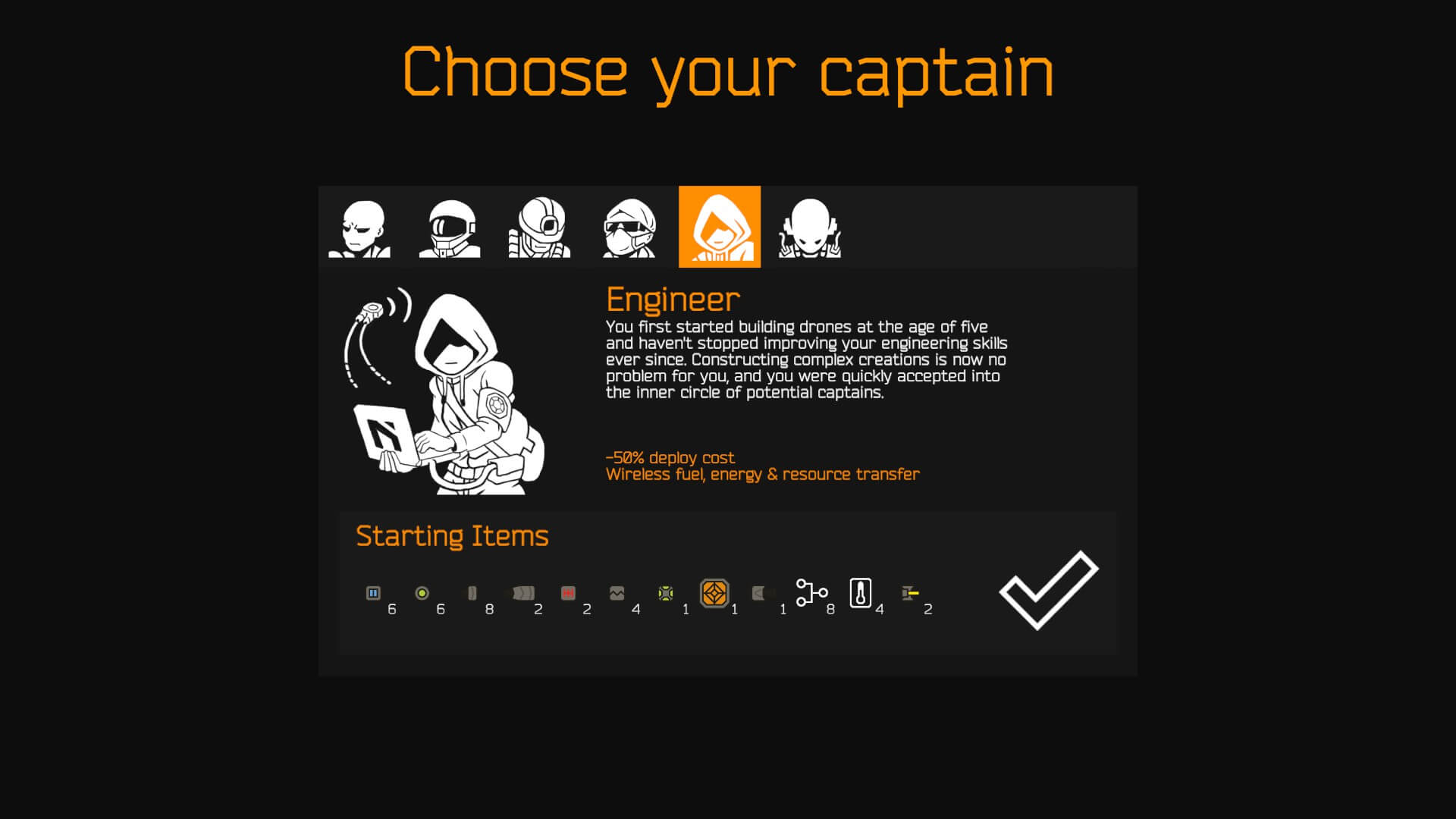 Normal/Hard | Takes advantage of having a separate fuel/battery source not attached to your main drone. If you have a good understanding of drone building, the Engineer is a strong captain. |