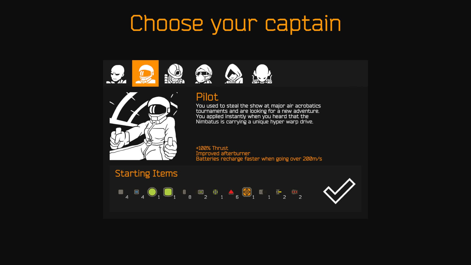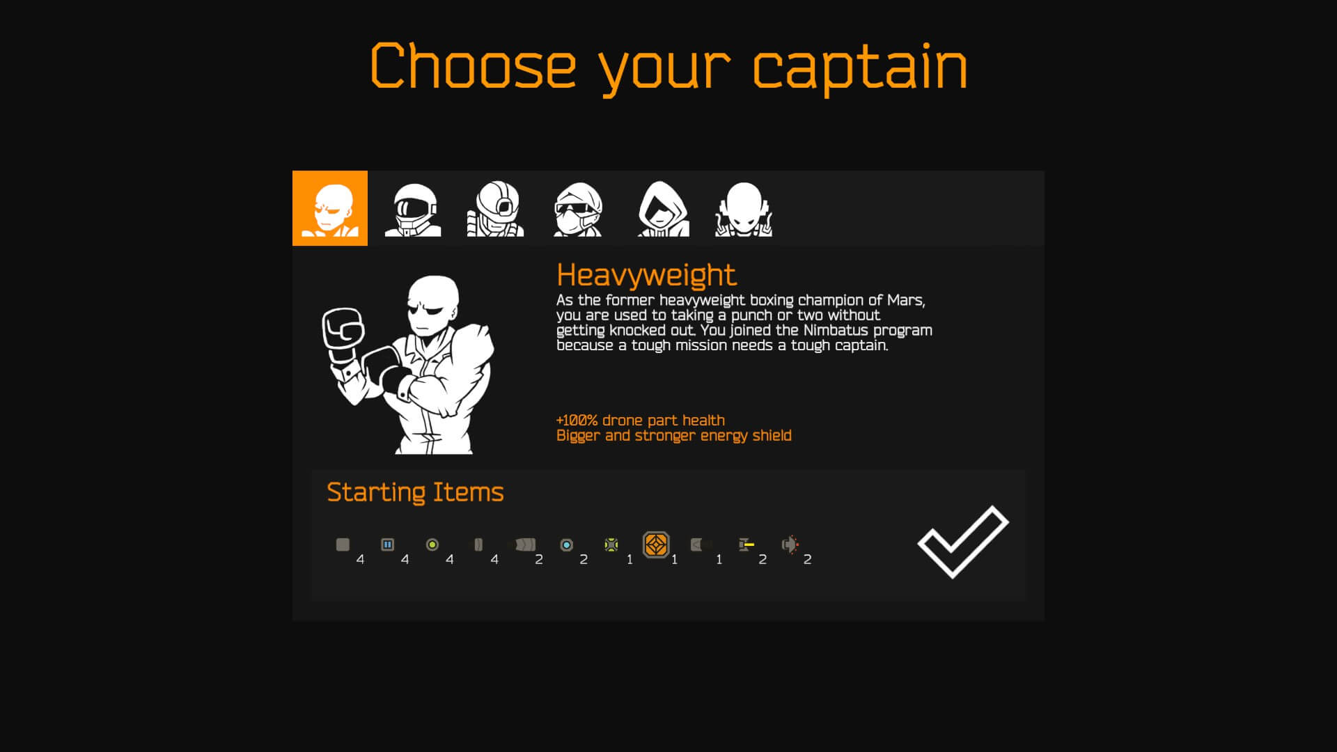 Deciding what captain is best in Nimbatus revolves around your playing style more than which has the best advantages. Each captain’s perks, difficulty, and playstyle are described below. If you’re a beginner, the Heavyweight and Researcher are great starters.
