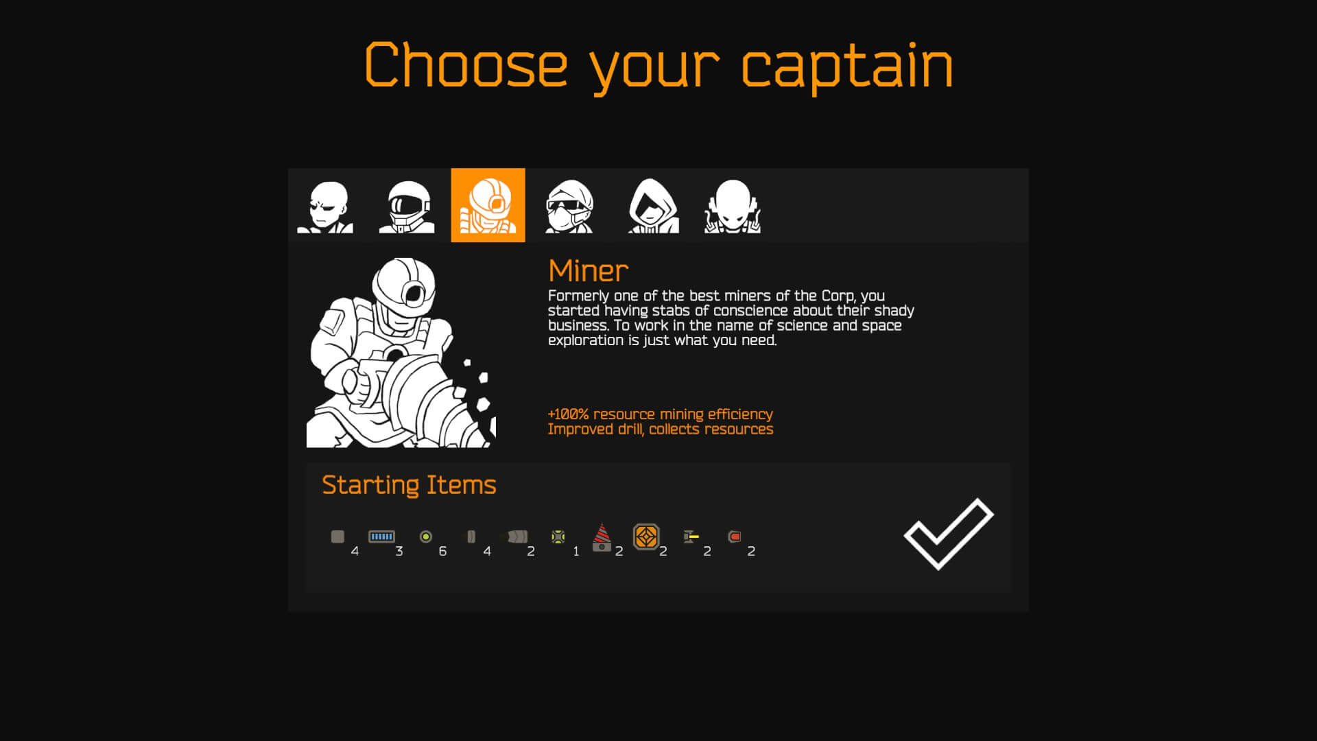 Normal | Revolves around taking advantage of your resource mining bonus. Relies on using a Drill instead of a Resource Collector like other starting captains. |