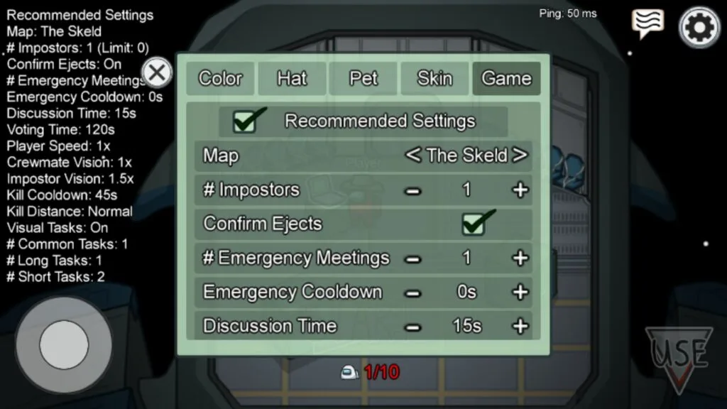 Tap the laptop directly or tap the Use button at the bottom right corner when near the laptop. Move along the taps of this new menu to the “Game” tab. This area will have all the choices for what map you want to pick, how many imposters, vision, player speed, etc. If you’re not sure what settings to pick, you can always check the Recommended Settings box at the top to reset them.
