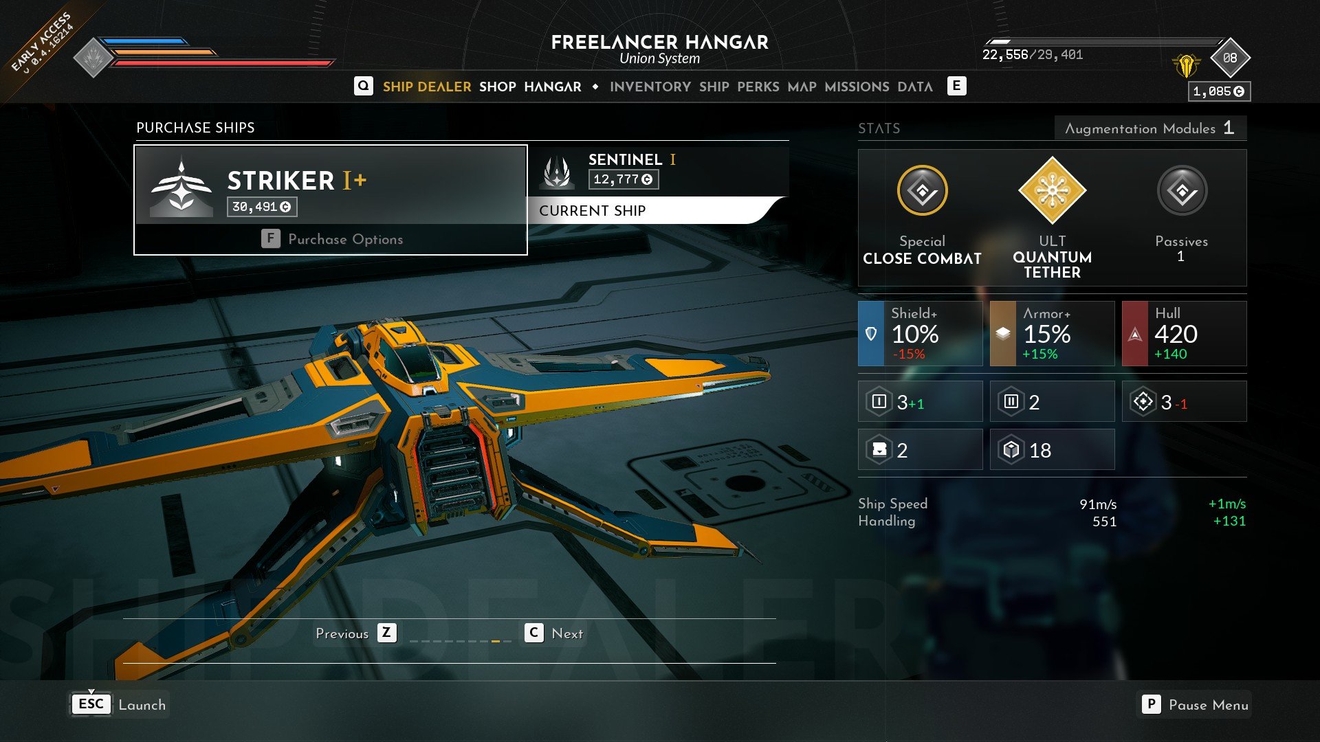 This is an upgraded version of the Striker I, that is first available at Nephtys Plains Station. The Striker I+ is an overall upgrade to each stat with increased shield, armor, and health compared to the previous tier. You can purchase it at the Freelancer Hangar in Union System for 30,491 credits. See below for the Striker I+’s stats.