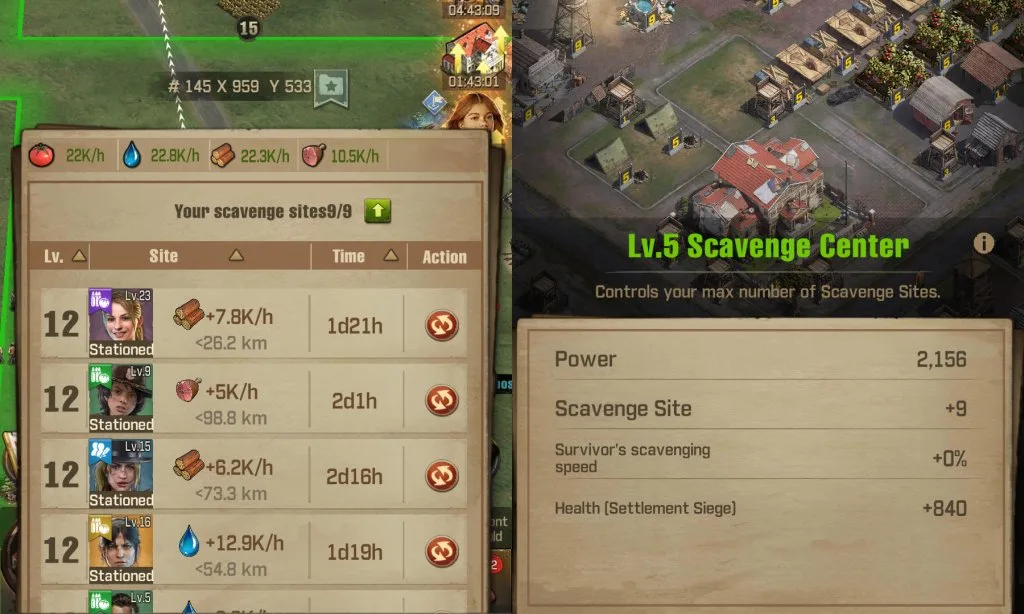 The second method is building a Scavenge Center so you can assign survivors to gather resources. Areas on the map like Veggie Farms and Lumber Mills are a great way to bring in extra resources. You can send a formation to gather from them or assign a survivor for steady supplies. While you’ll get more food from a Veggie Farm by sending a large formation, the flow from one survivor is consistent. This is a great way to keep your survivors busy, especially early on.