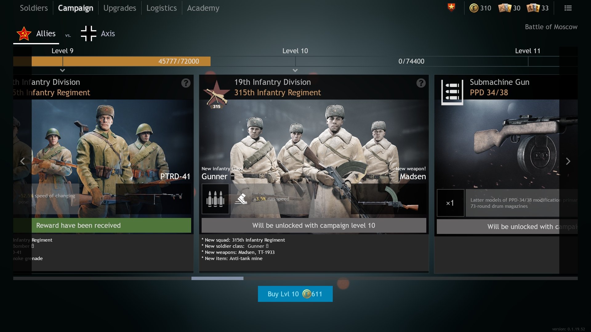 Before we get into how to level up fast, it’s important to talk about each type of level in Enlisted. Every campaign such as the Battle of Normandy or Battle of Moscow each has two campaign levels. There’s one for each faction such as the Allies or Axis. This is why it doesn’t hurt to prioritize a campaign and faction so long as your matchmaking times aren’t too bad.
