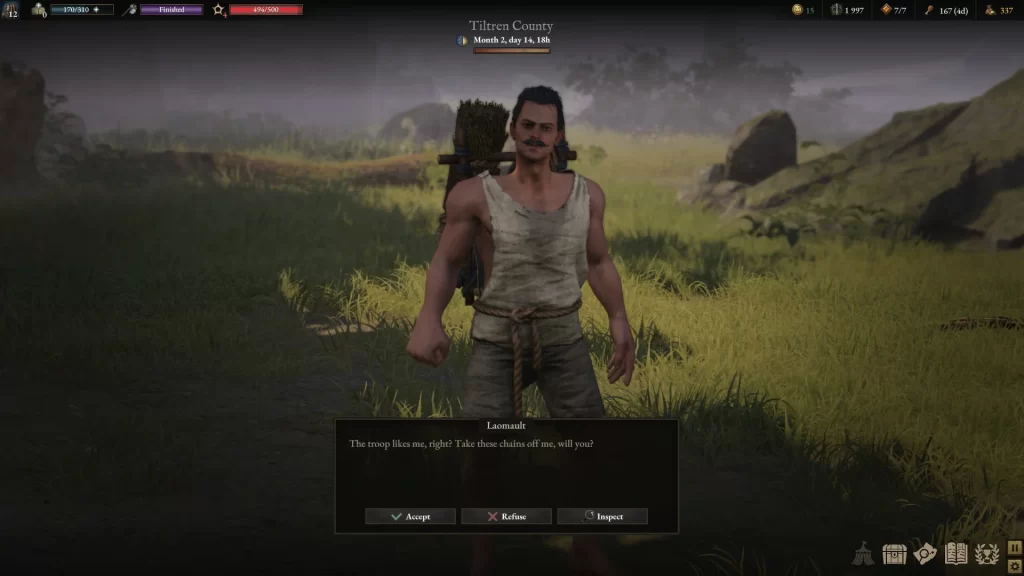 It’s almost always something simple about how they’re feeling, what they’re thinking about, or a recent event. Then, you get a few choices that may have good or bad outcomes. Regardless, this is the same case for recruiting a prisoner in Wartales. They’ll eventually have a question mark above their head and ask to join.