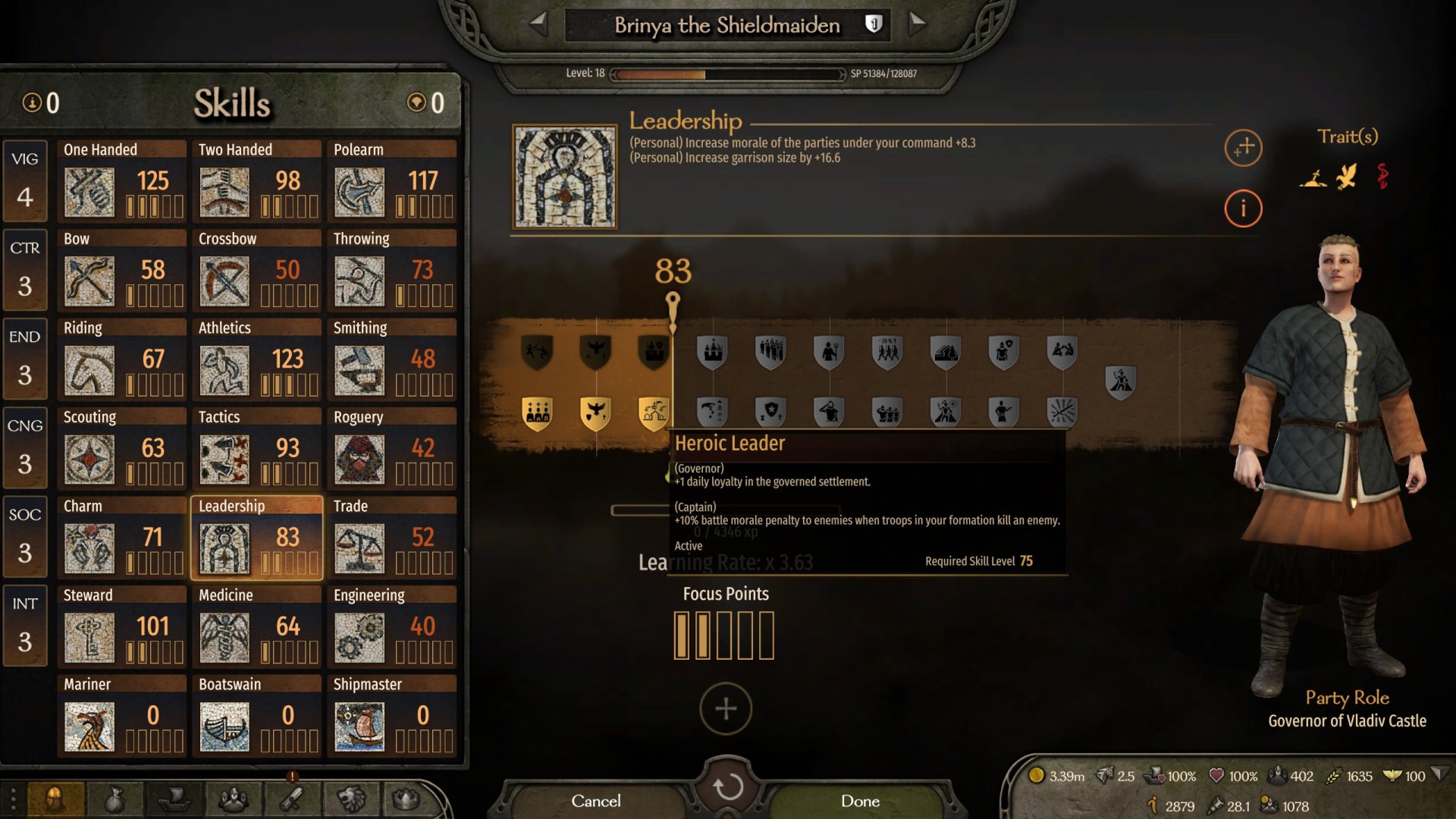 Mount & Blade 2 Bannerlord character screen showing the Leadership perk Heroic Leader.